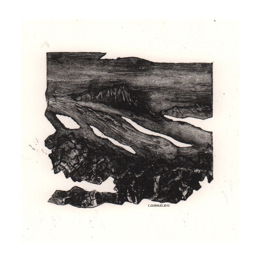 Avec la pointe, en dessinant on va créer des creux qui seront le réceptacle de l'encre. Ainsi nous pouvons encrer cette feuille de tetra pack comme une plaque de zinc mordu et passer à la presse pour le tirage.
