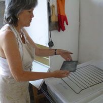 Pour voir si une aquatinte est réussie, tremper la plaque qq secondes et regarder au compte fil, si trop espacé, ou trop serré... pas bon. Vous pouvez enlever la résine et refaire l'opération.