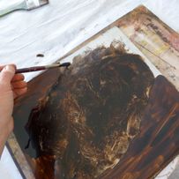 . On dépose la feuille de dessin, et l’on dessine.Le crayon appuie sur le vernis, le vernis est donc absorbé par le papier.