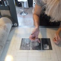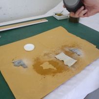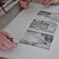 Le papier est ensuite posé sur la plaque de zinc (colle vers le ciel), on place ensuite notre papier. On tourne la presse, ainsi le tirage et le collage du papier se fait simultanément. Attention à lever délicatement l'épreuve.