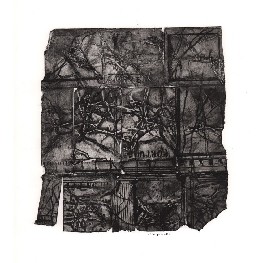 Avec la pointe, en dessinant on va créer des creux qui seront le réceptacle de l'encre. Ainsi nous pouvons encrer cette feuille de tetra pack comme une plaque de zinc mordu et passer à la presse pour le tirage.