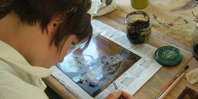 . On prépare le dessin sur une feuille, en veillant à placer des repères. On peut ainsi reproduire le dessin qui se trouve sur cette feuille. En utilisant un papier grainé, le trait sera plus diffus, moins net(effet crayon de papier). Eviter la feuille calque, pas assez absorbante.